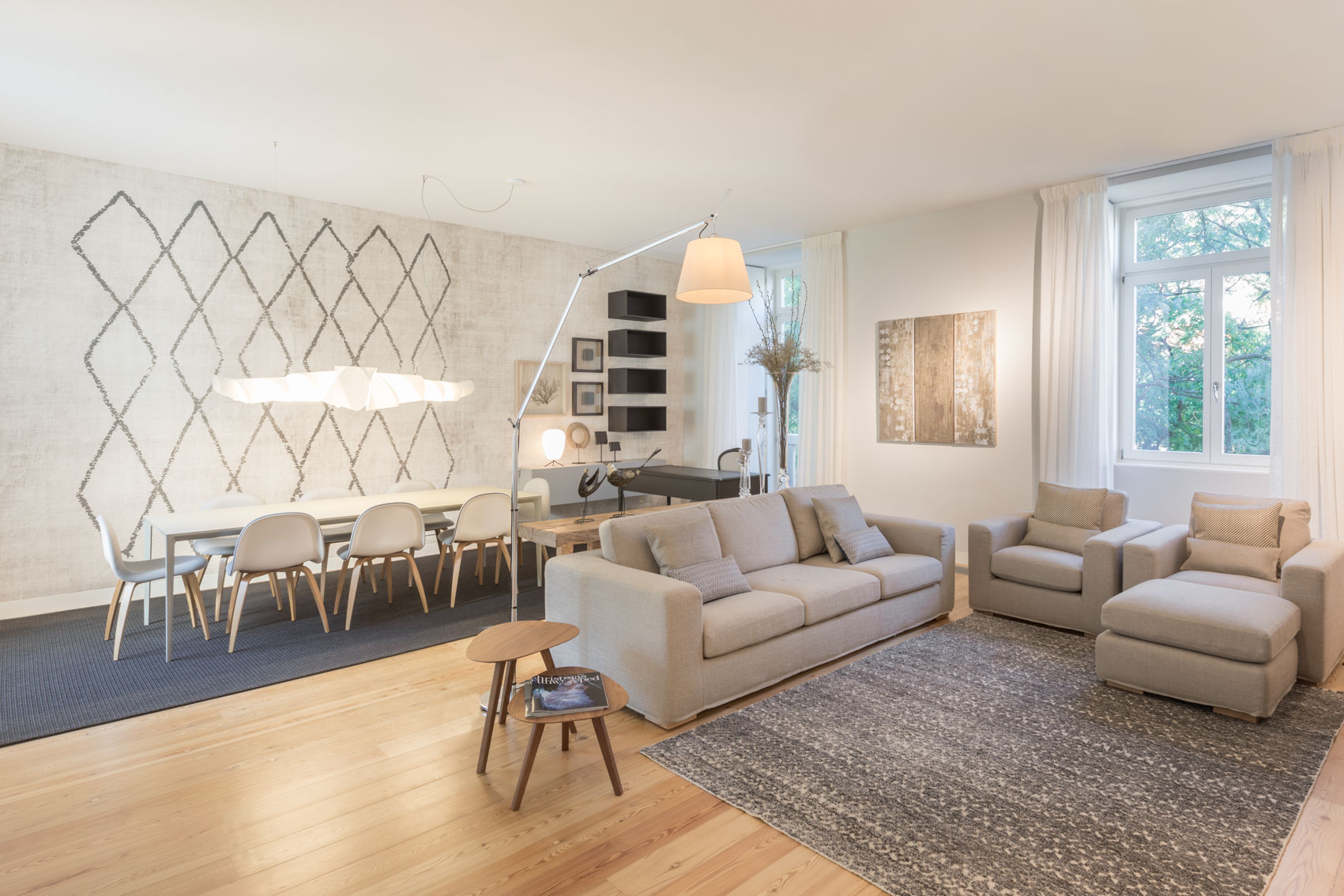Decoração de apartamento contemporâneo com estilo de tons neutros, as madeiras e linhas depuradas.